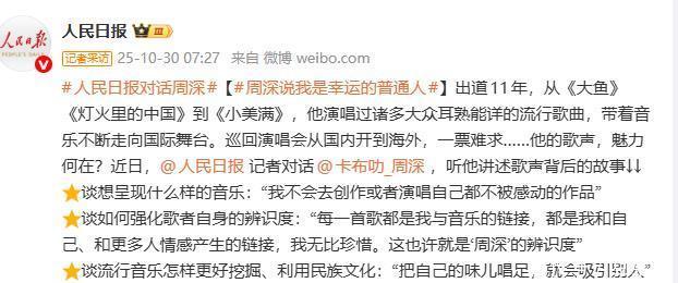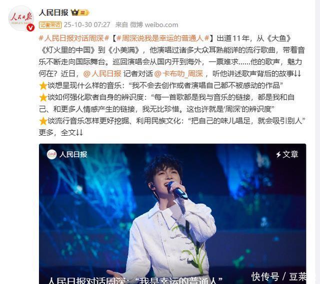 而在中秋晚会上,周深将《归来》作为抗战胜利80周年献礼曲。 被央视评价他的歌声为“用青年之声承载历史厚重”。 而在近日,人民日报更是发布了对周深专访的谈话细节。