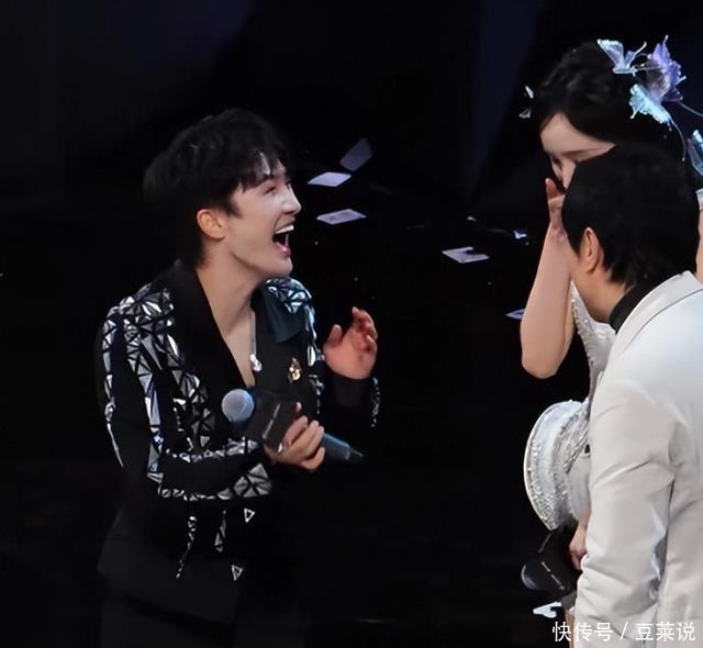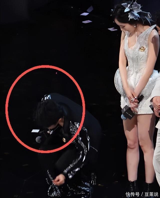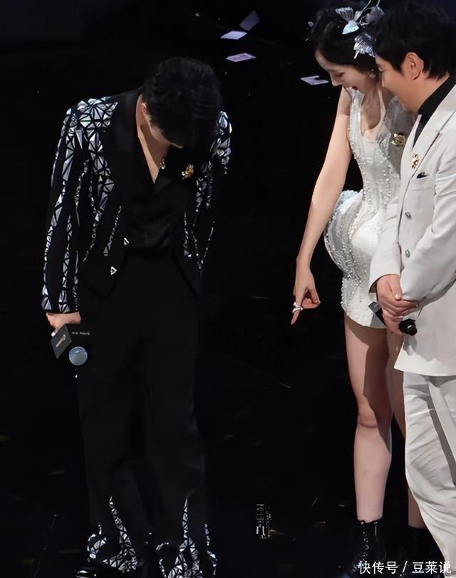 但由于杨幂穿的是短裙,且舞台反光的原因所以没有直接蹲下捡起。 因此三个人因这个彩带开启了新的话题。 不一会,周深则蹲下捡起了这个彩带,但他在做这个举动的时候还有一个小细节。