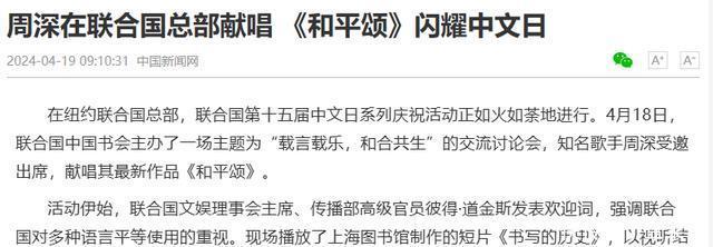 “音乐公益大使” 2024年4月,周深受邀出席了第15届联合国活动。 并为此次活动献唱了专门制作的主题曲《和平颂》。